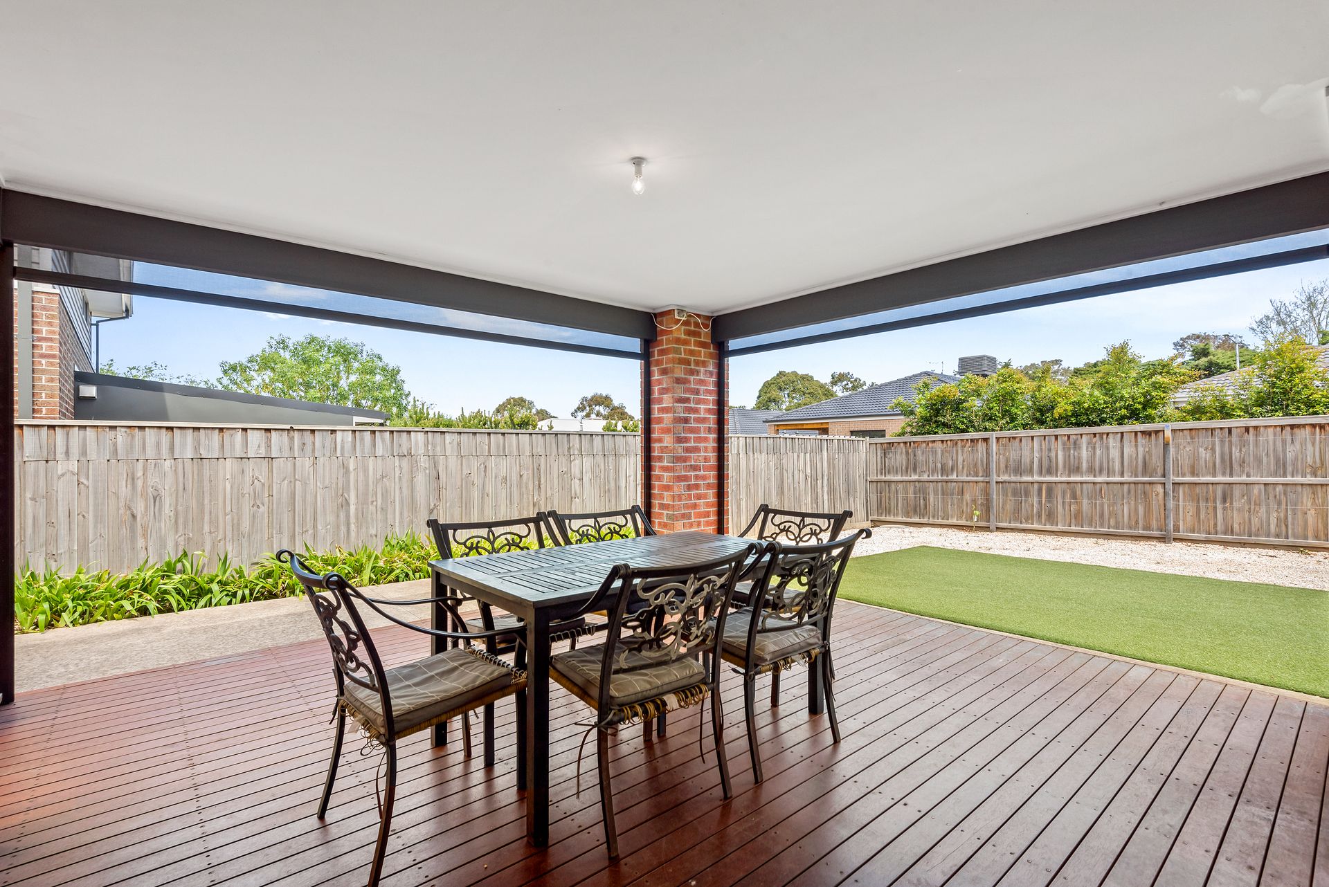 The kitchen stands as a focal point, offering premium amenities and a spacious walk in pantry. The living room extends to a covered, decked alfresco area surrounded by green grass and pebbles, providing a perfect setting for outdoor entertaining.